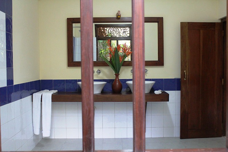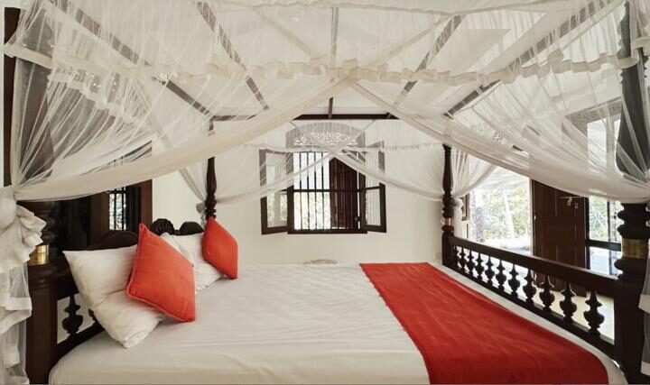 Ground floor – One spacious A/C bedroom, with ceiling fan, four poster bed with mosquito netting drapped, attached dressing room and spacious tiled bathroom with his and her washbasin.